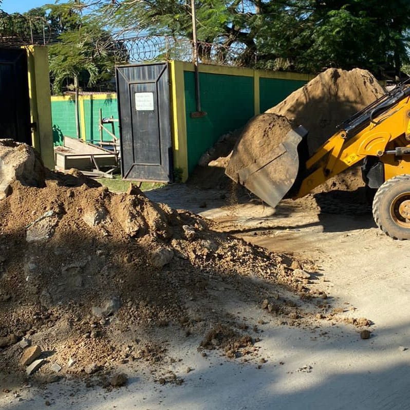 Se realiza fundición de acera, instalación de cielo falso y relleno con material selecto para nivelación del terreno.