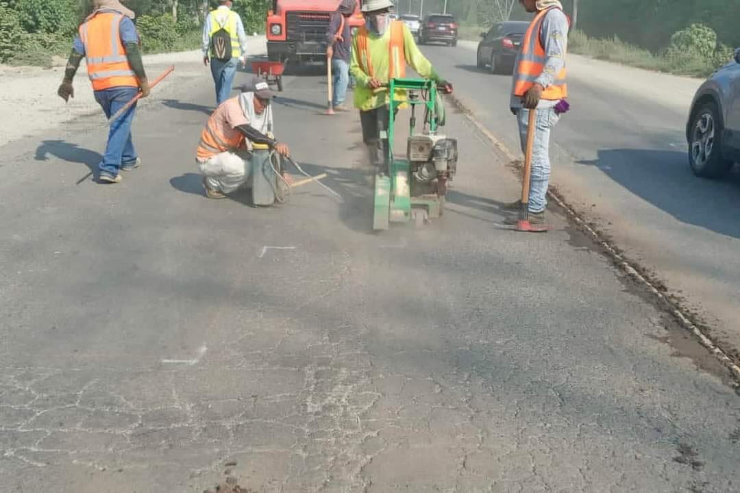 Este día nuestro equipo ejecuta trabajos de bacheo con concreto asfáltico en la calle hacia aldea El Carmen.